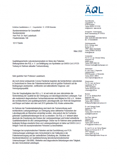 ÄQL e. V. kritisiert bereits während der Pandemie die Befähigung nichtärztlicher Leistungserbringer, auch Apotheker:innen, zur Durchführung von SARS-CoV-2-PCR-Testungen. Eine der Hauptaufgaben des ÄQL e. V. ist seit mehr als zwei Jahrzehnten die Sicherstellung der Qualität bei Erbringung labordiagnostischer Leistungen. Insbesondere die Ermächtigung nichtärztlicher Leistungserbringer zur Erbringung eines definierten Parameters der Labordiagnostik, ohne geltende, nach Bundesärztekammer verbindliche Qualitätsanforderungen (Rili-BÄK) einzuhalten wird bemängelt. Eine Qualitätssicherung ohne diese verbindliche Einhaltung der Rili-BÄK ist so nicht gegeben.